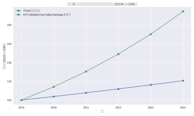 こちらが「iTrustインド株式」と「EPI(WisdomTree India Earnings ETF)」の過去5年間リターン推移グラフです。