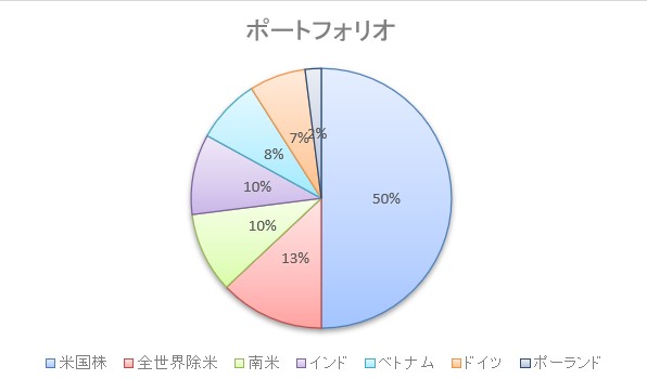 米国(50%)・全世界株式除く米国(13%)・南米(10%)・インド(10%)・ベトナム(8%)・ドイツ(7%)・ポーランド(2%)