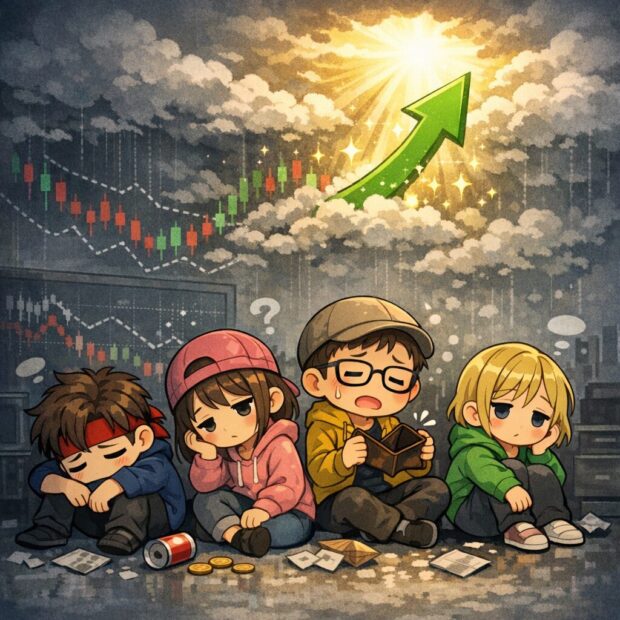 - みんなの心: 「もっと下がるかも!怖い!もう一生買わない!」とパニック。