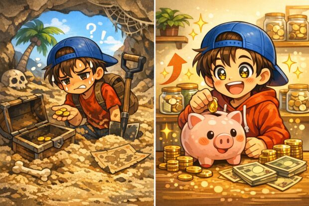 難しいことを考えて悩むよりも、「毎月コツコツ、貯金箱にお金を入れること」を続けるほうが、実はずーっと効率的にお金が溜まっていくんだよ。