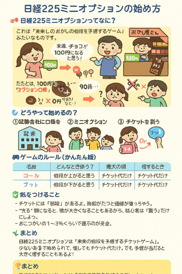 もちろん、akiさん。小学生にも分かるように、日経225ミニオプションの始め方を「おかし屋さんのゲーム」にたとえて説明しますね🍭
